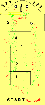 na dvoch nohách, ale po slepiačky. Ak sme správne skočili na pole číslo